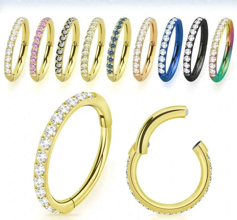 Dodej svému piercingu dotek elegance – tento kroužek zdobený syntetickými zirkony v různých barvách vytváří nadčasový a sofistikovaný vzhled.