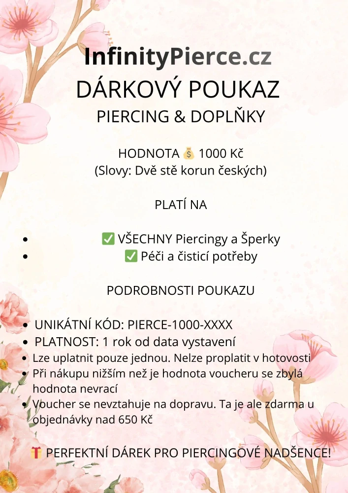 Nevíte si rady s výběrem? Obdarujte své blízké dárkovým voucherem v hodnotě 200 Kč/500 Kč nebo 1000 Kč, který může uplatnit kdykoliv do 1 roku od nákupu v našem eshopu www.InfinityPierce.cz