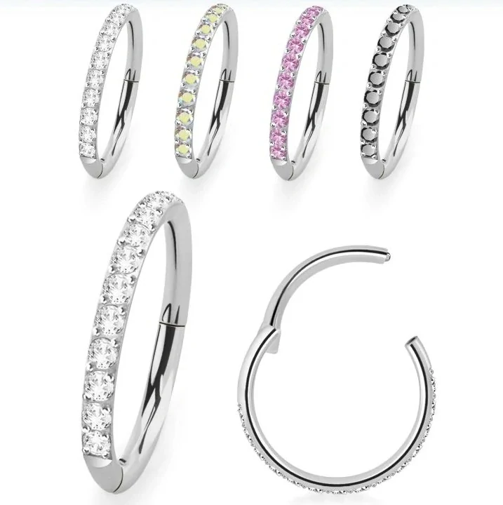 Dodej svému piercingu dotek elegance – tento kroužek zdobený syntetickými zirkony v různých barvách vytváří nadčasový a sofistikovaný vzhled.