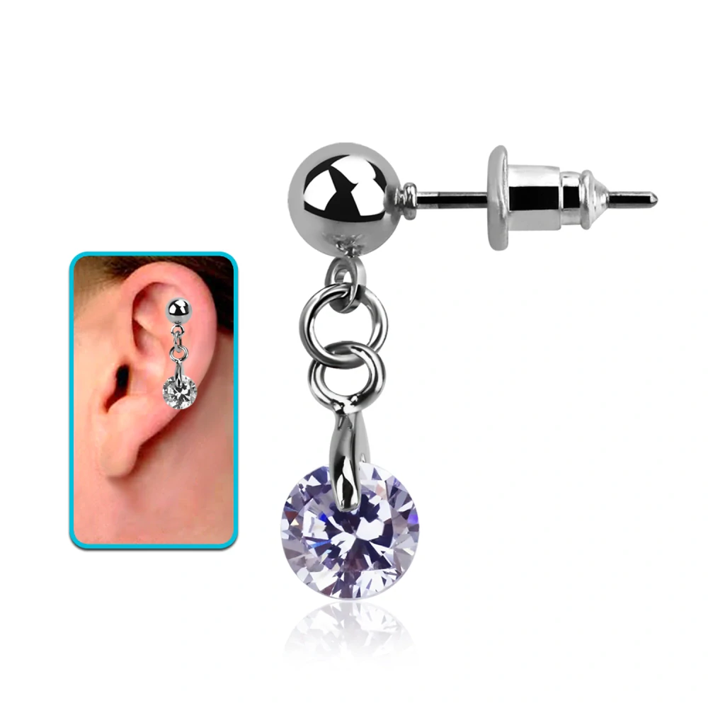 Stylový piercing do ucha z odolné chirurgické oceli s ozdobou v podobě visícího kamínku. Dostupný v různých barvách – růžová, čirá, fialová. Skvělý pro ušní lalůček nebo jako doplněk do více piercingů. Dodá tvému vzhledu jemnou eleganci a třpyt. celý popis