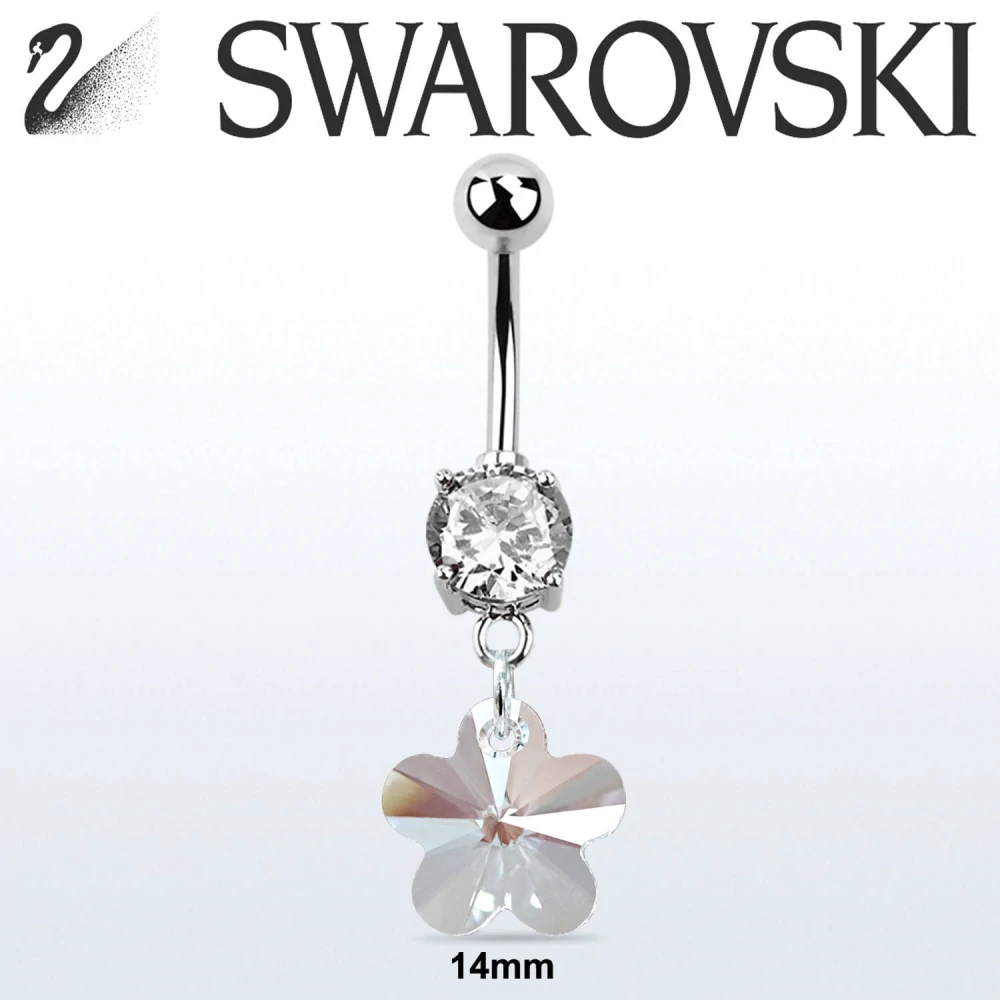 Horní část piercingu zdobí precizně vsazený kulatý čirý Swarovski krystal, pod kterým je zavěšen visací Swarovski krystal ve tvaru květiny o velikosti 14 mm. Květinový brus vytváří nádherné světelné odlesky a dodává piercingu jedinečný, luxusní vzhled.