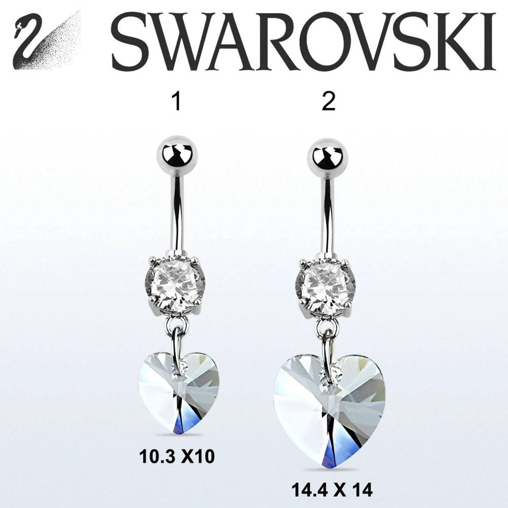 Horní část piercingu tvoří kulatá lesklá kulička a pod ní zasazený čirý kamínek, který dodává šperku jemný, elegantní třpyt. Dominantou je nádherné srdce Swarovski®, dostupné ve dvou velikostech – menší 10,3 × 10 mm nebo výraznější 14,4 × 14 mm. Perfektní volba pro ty, kteří chtějí ozdobit pupík luxusním, poutavým a zároveň bezpečným šperkem.