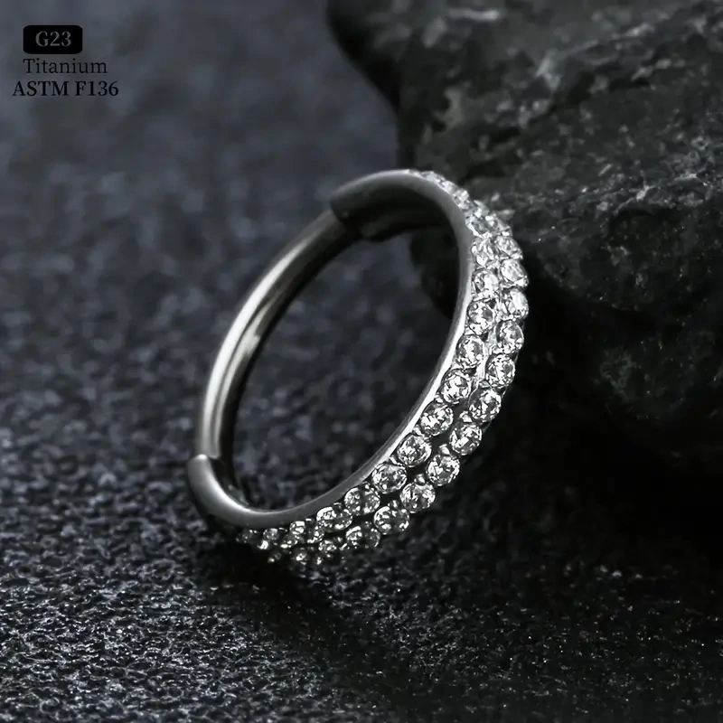 Tento elegantní piercingový kroužek z titanu G23 okouzlí svým luxusním vzhledem a precizním zpracováním. Je zdoben dvěma řadami čirých zirkonů, které krásně odrážejí světlo a dodávají šperku výjimečný lesk.