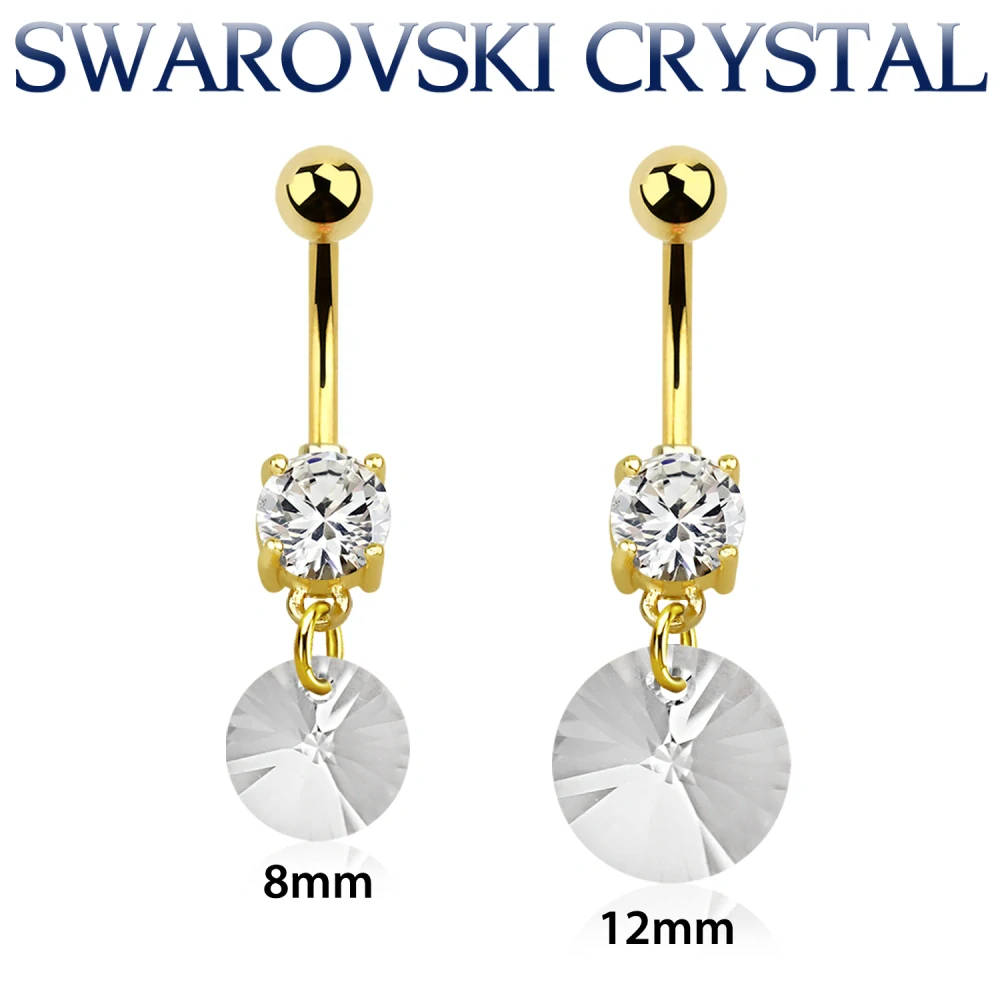 Elegantní zlatý piercing z chirurgické oceli 316L s čirým Swarovski krystalem a visacím krystalem ve velikosti 8 mm nebo 12 mm. Luxusní třpyt, bezpečné nošení a nadčasový design. celý popis